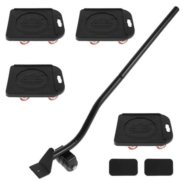 This standalone lifter is one of the best furniture lifters and has some truly impressive ergonomics that are not found even in well-stocked furniture moving kits. It comes with an adjustable and detachable wheel that you can reposition along the handle for the right leverage depending on the type of furniture you are lifting. The wheel can go closer to the lever head or further away so that the lever can be pivoted as you like. In contrast, most other levers have a fixed pivot point that cannot be repositioned. The above lifter allows you to easily lift up to 400 lbs. of furniture and appliances, so you can move beds, sofas, tables, cabinets, stone benches, and electrical machinery. It is made of solid stamped steel for extra durability and effectiveness. The sturdy construction is ideal for long-term uses and is quite rigid for heavy-duty furniture lifting. It works perfectly on its own and is a great tool for instantly lifting obstacles out of the way and reaching under the furniture when you are cleaning, vacuuming, or mopping. However, the lack of roller trays and sliders can limit its functionality and require more manual input if you actually want to move your furniture somewhere else.